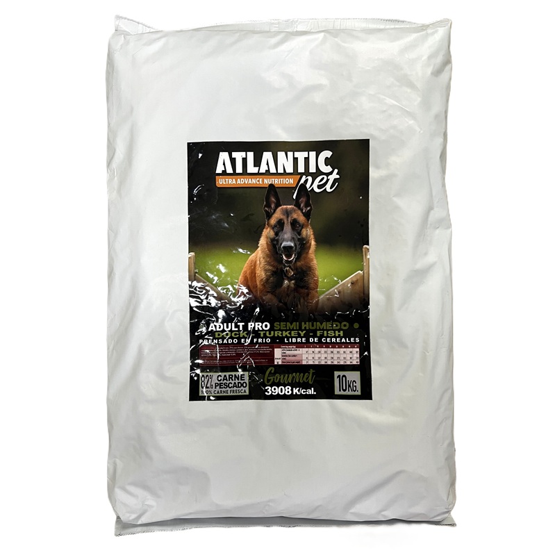 Atlantic Pet Pro Semihúmedo Adulto con Pato, Pavo y Pescado es una receta completa, equilibrada y altamente palatable, pensada para perros adultos de todas las razas. Su fórmula incluye un 82% de ingredientes frescos de origen animal, combinando pato, pavo y una selección de pescados azules, lo que garantiza una nutrición de alta calidad, rica en proteínas y ácidos grasos esenciales.