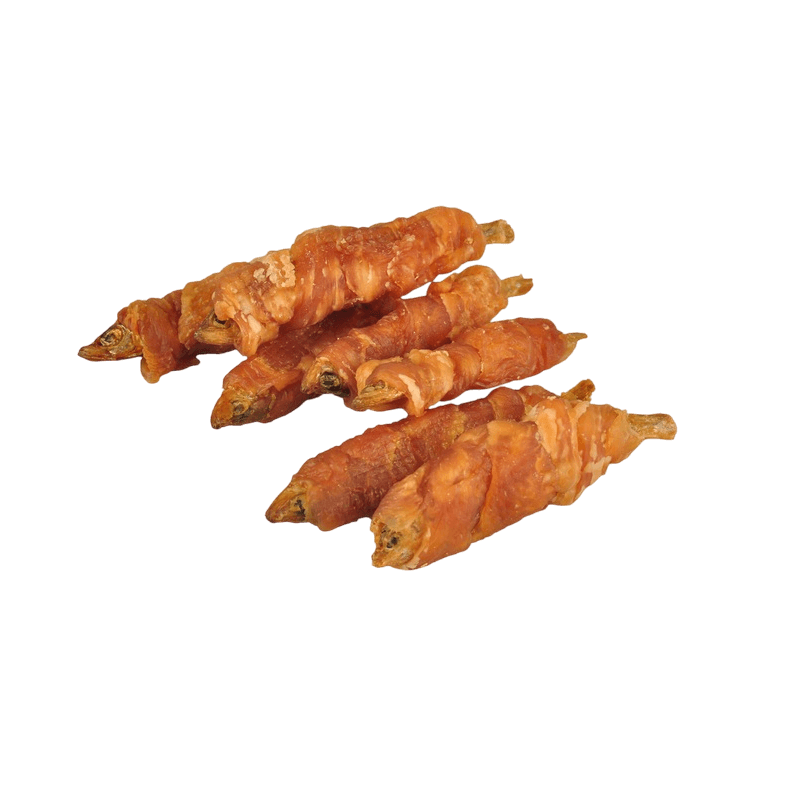 El Snack Natural Pescadito con Pollo es una deliciosa combinación de pescado entero envuelto en tiras de pollo deshidratado. Una golosina irresistible que mezcla sabor, textura y nutrición, perfecta como premio diario o snack funcional.