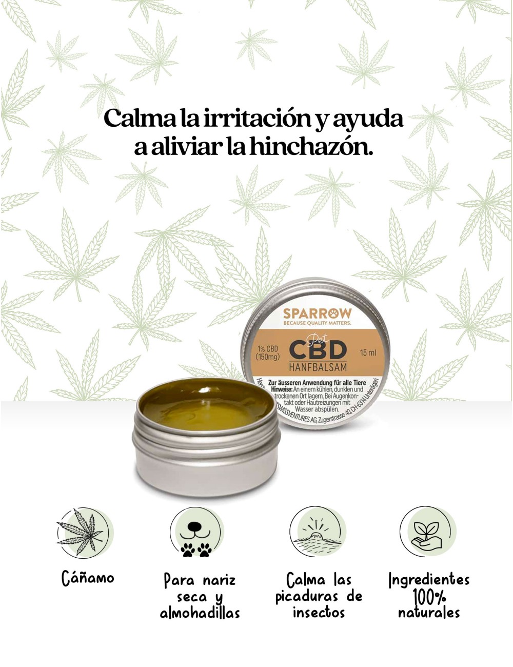 El bálsamo de cáñamo SPARROW Pet es una solución natural y eficaz para el cuidado de la piel de tu mascota. Su fórmula con 1% de CBD, aceites vegetales y extractos botánicos está especialmente diseñada para hidratar, calmar y reparar zonas afectadas por picaduras, eccemas, irritaciones, grietas, hinchazón o sequedad extrema.
